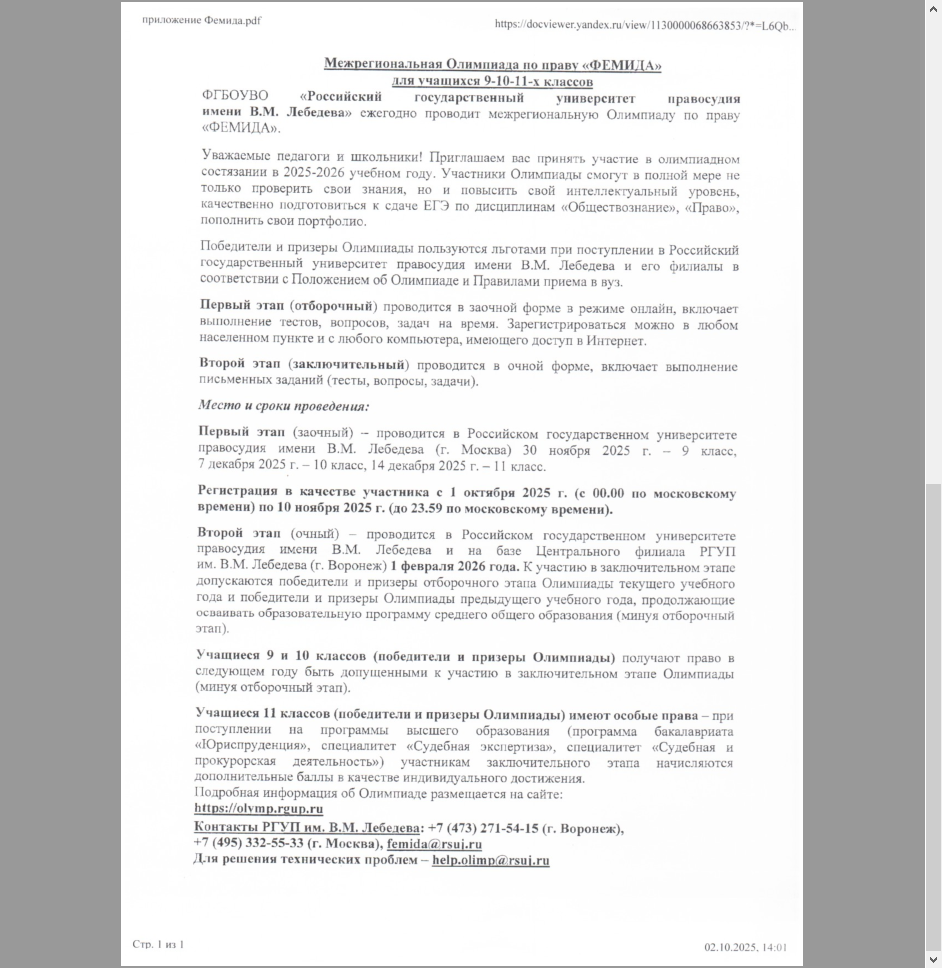 Информация о проведении Межрегиональной олимпиады по праву "Фемида" для учащихся 9-11 классов